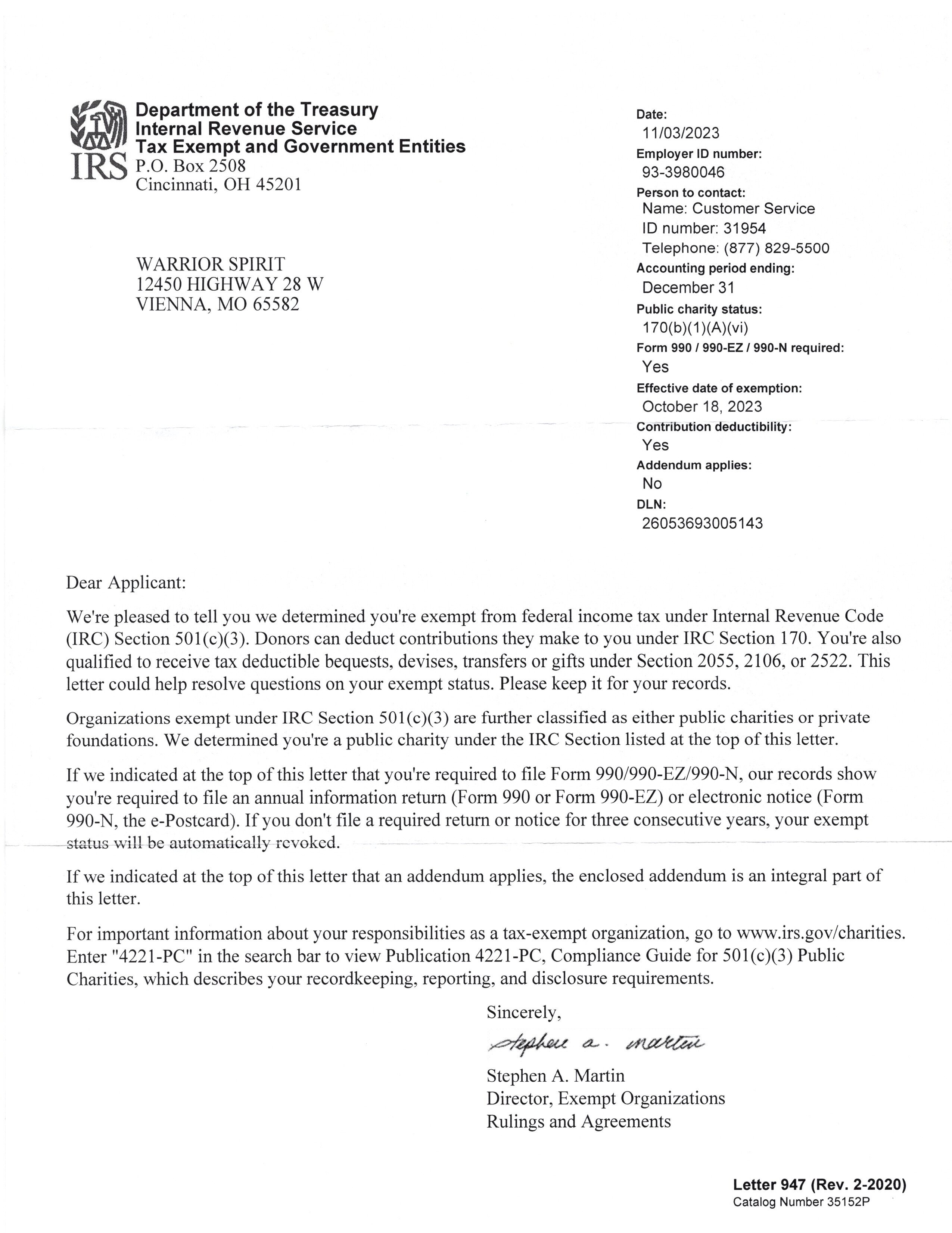 As A Non-Profit Entity, Warrior Spirit Can Only Exist Through The Kindness And Generosity Of Others To Help Us Accomplish Our Mission. Please Help Us Save Lives. Financial And/ Or Product Sponsorship Is 100% Tax Deductible And Enables Us To Reach Our Warriors Face-To-Face.